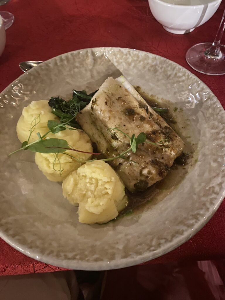 We had champagne cocktails which was followed by an amuse bouche, the wine service then followed along with sparkling water for the table. Then we had our scallops starter followed by lobster bisque…. I don’t like lobster bisque so Richard ate two bowls full LOL.