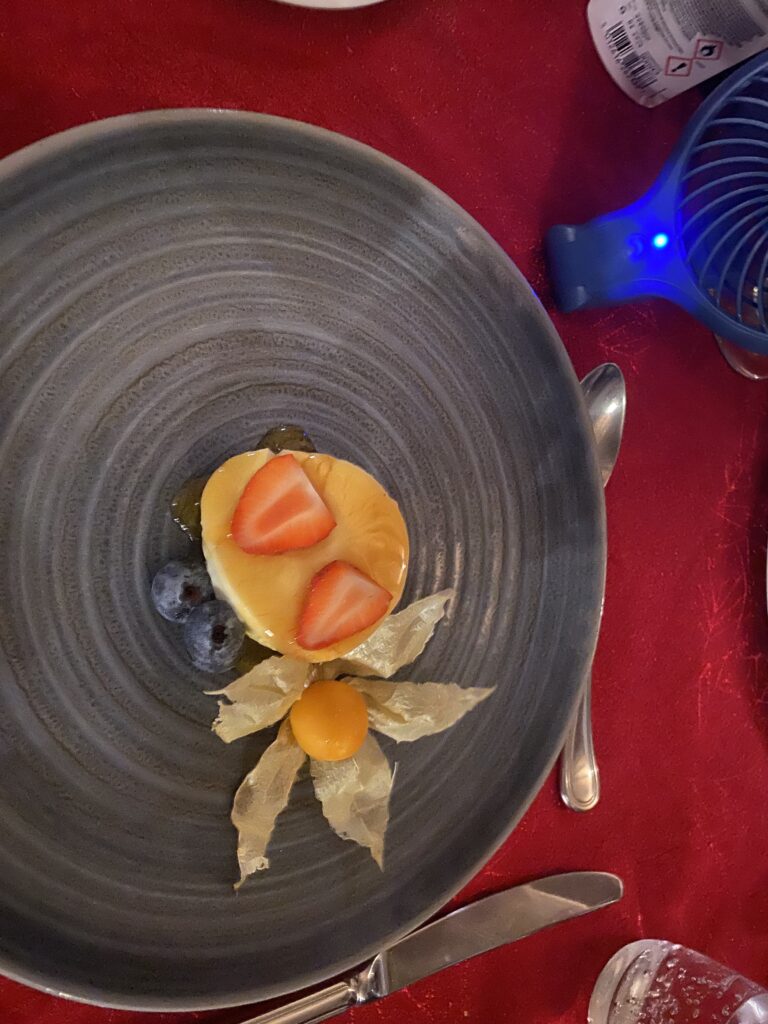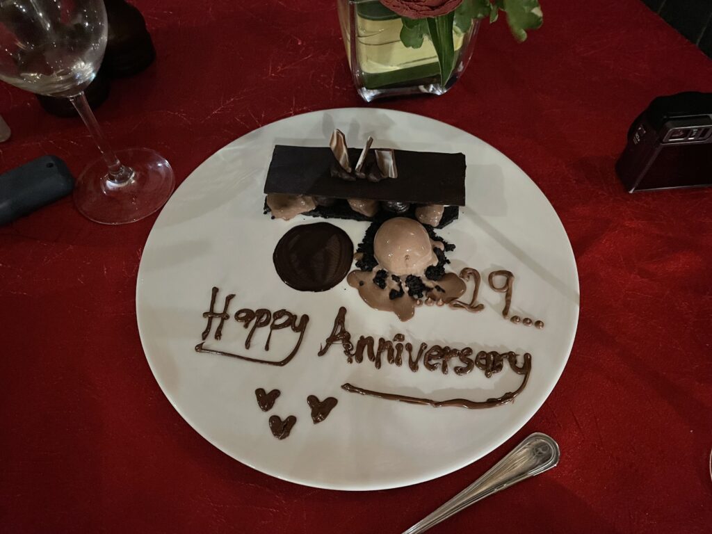Then to the main which was steak for me and sea bass for Richard followed by a special cheesecake and a chocolate Happy Anniversary plate. All delicious although very rich and decadent. We had enjoyed this special experience…felt very spoilt! We lingered after we had finished eating and our butler decided to bring us two additional glasses of complimentary champagne. How nice!