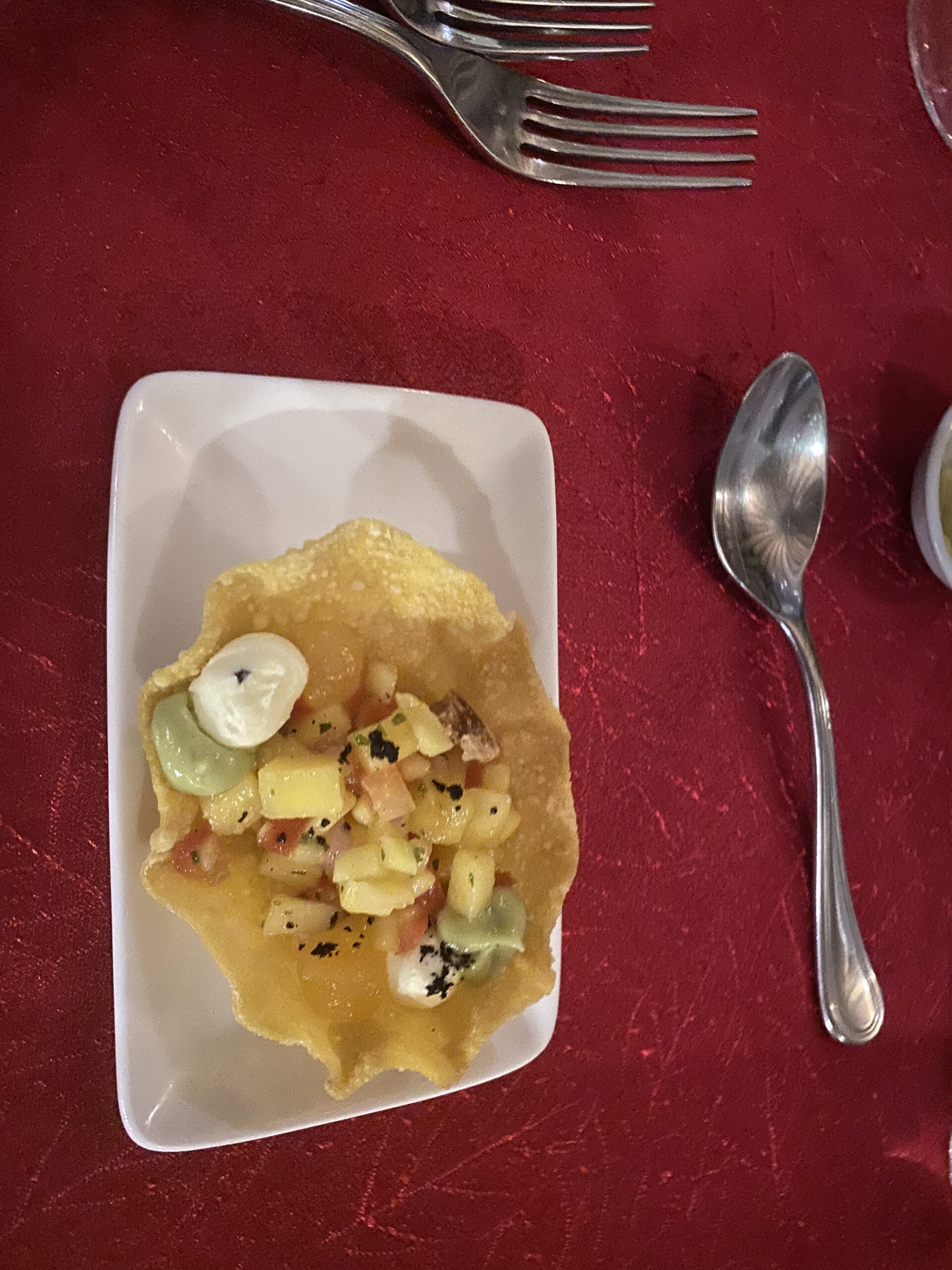 We had champagne cocktails which was followed by an amuse bouche, the wine service then followed along with sparkling water for the table. Then we had our scallops starter followed by lobster bisque…. I don’t like lobster bisque so Richard ate two bowls full LOL.