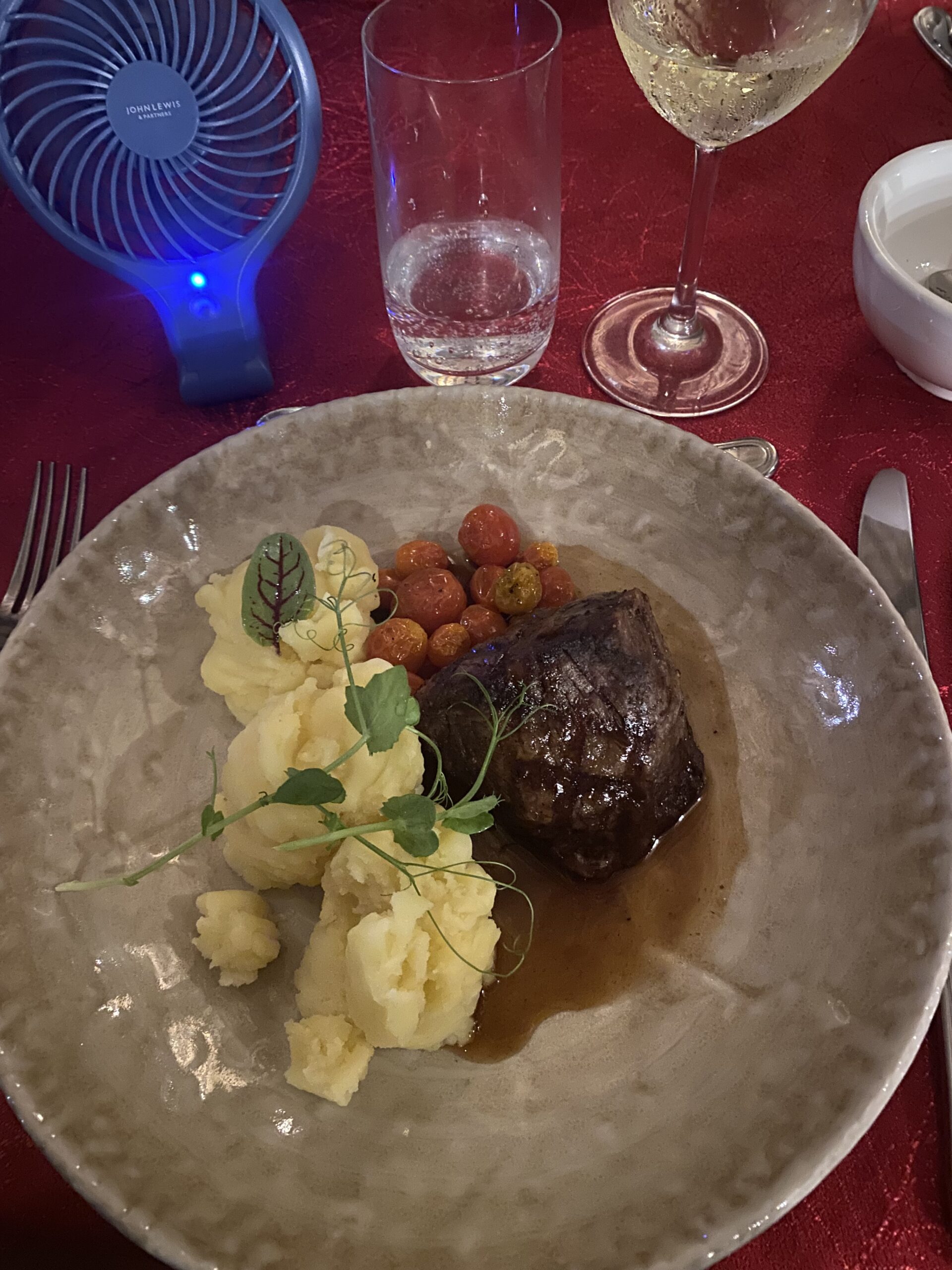 Then to the main which was steak for me and sea bass for Richard followed by a special cheesecake and a chocolate Happy Anniversary plate. All delicious although very rich and decadent. We had enjoyed this special experience…felt very spoilt! We lingered after we had finished eating and our butler decided to bring us two additional glasses of complimentary champagne. How nice!