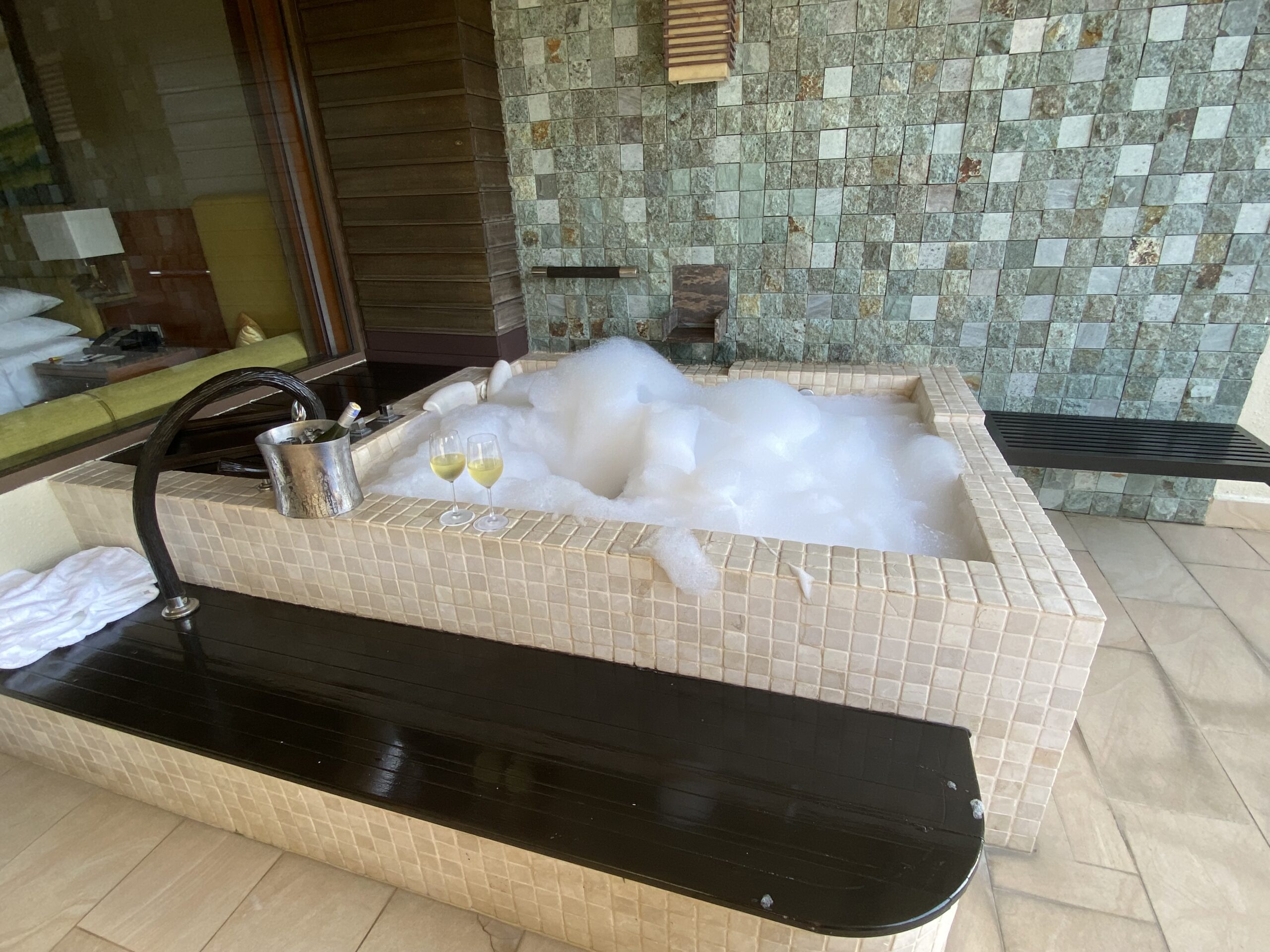 After breakfast we headed to the pool and enjoyed a day bobbing – it was blisteringly hot – so a lot of the time was spent in the shade. Returning to our room around 4.30 pm we enjoyed a bottle of wine and a huge bubble bath on our balcony (which was organised for us by reception).