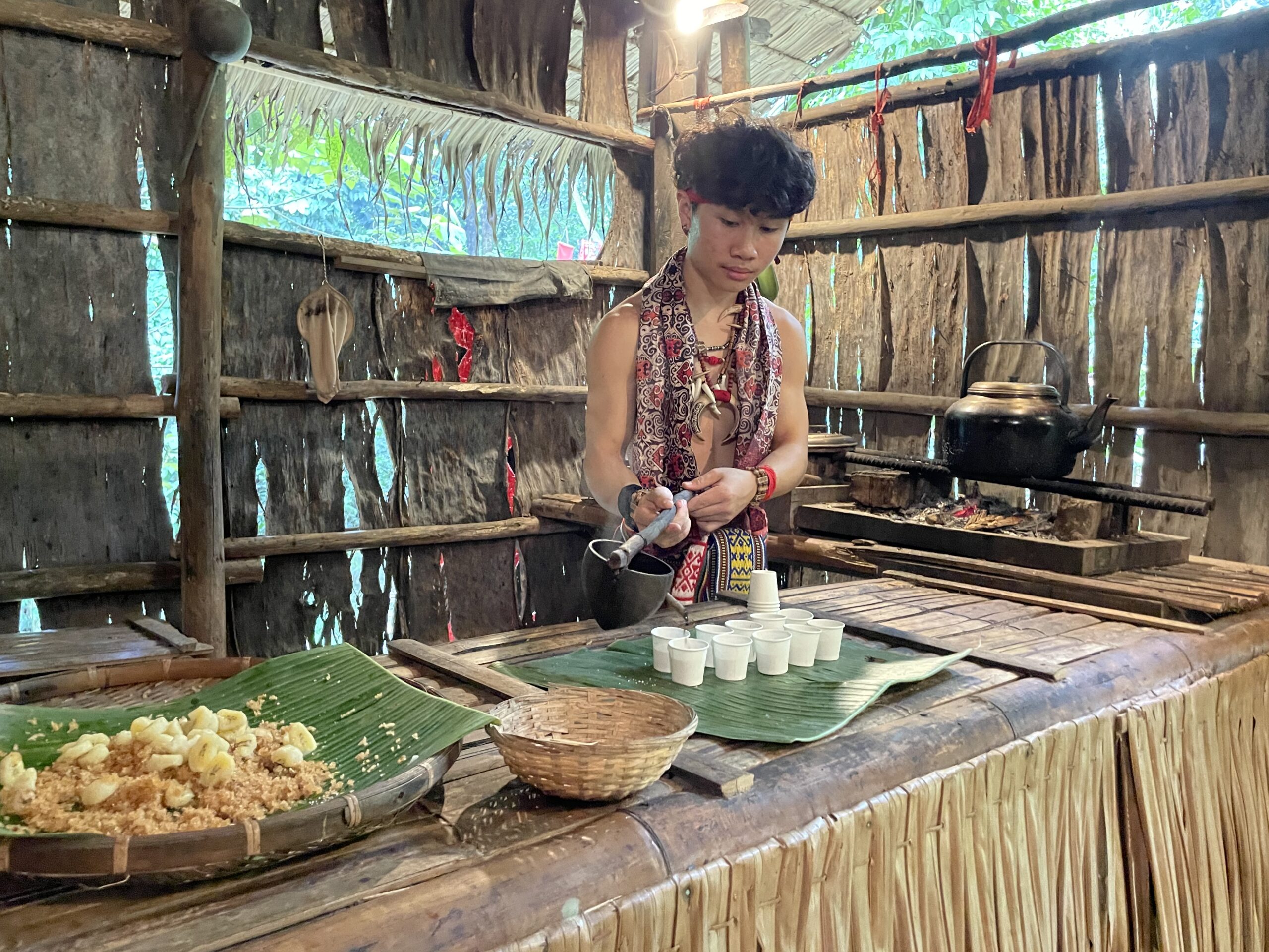 Throughout the tour we were shown different skills – how to make rice wine, and honey (with bees that don’t sting bizarrely), bamboo cooking, cloth and rope making, fire making etc. Richard tried everything but I declined as my stomach was complaining…so I had to run off to find bathroom facilities during the tour….which were western again but not so clean!