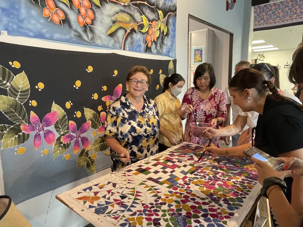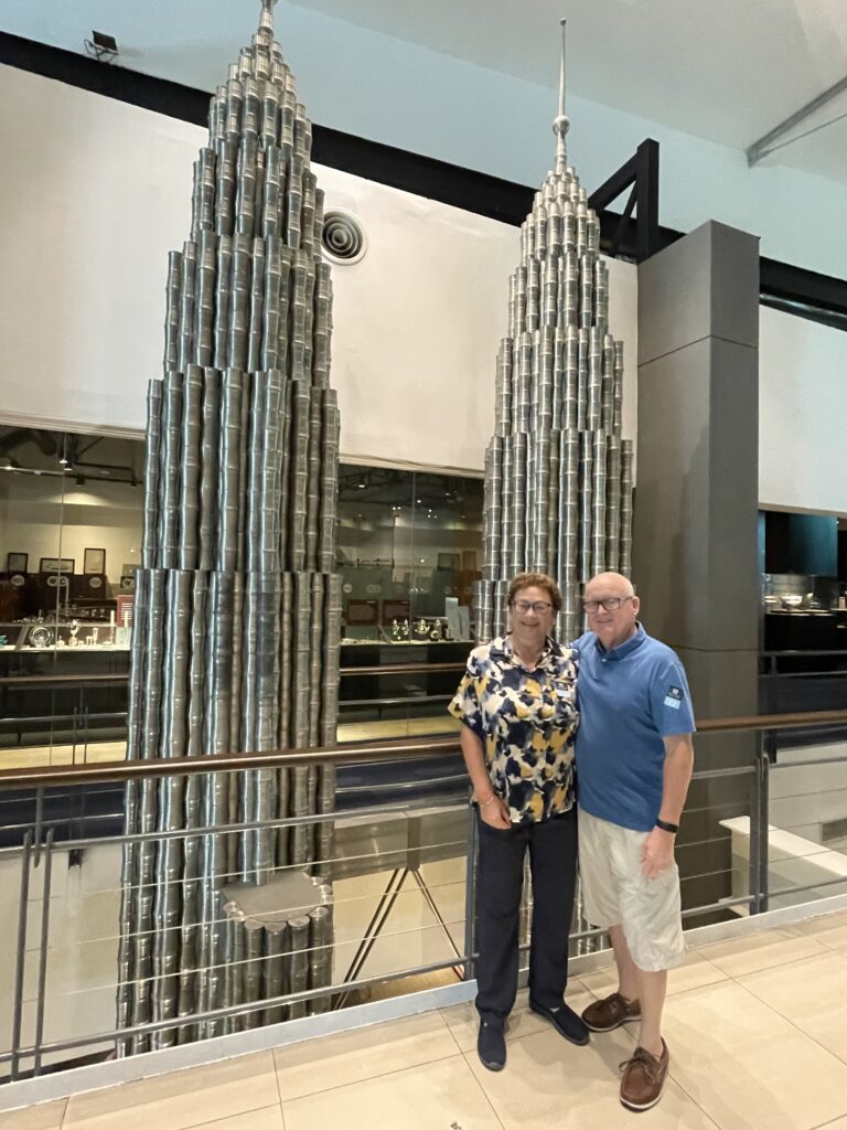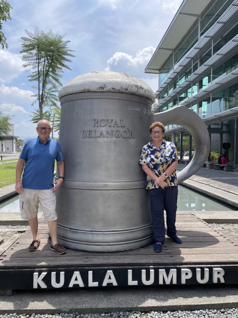 Then onto the Chinese Temple which was beautiful before heading to the Selangor Pewter factory. Interesting place and some beautiful items to purchase but, on a restricted luggage allowance, that wasn’t going to happen LOL. But we did enjoy seeing the Giant Tankard and some of the Formula 1 trophies that they manufacture. Afterwards we headed to the Batik Centre and enjoyed watching the artists designing by eye some fantastic materials….absolutely beautiful!