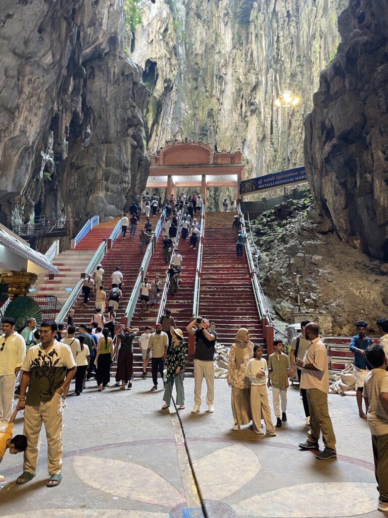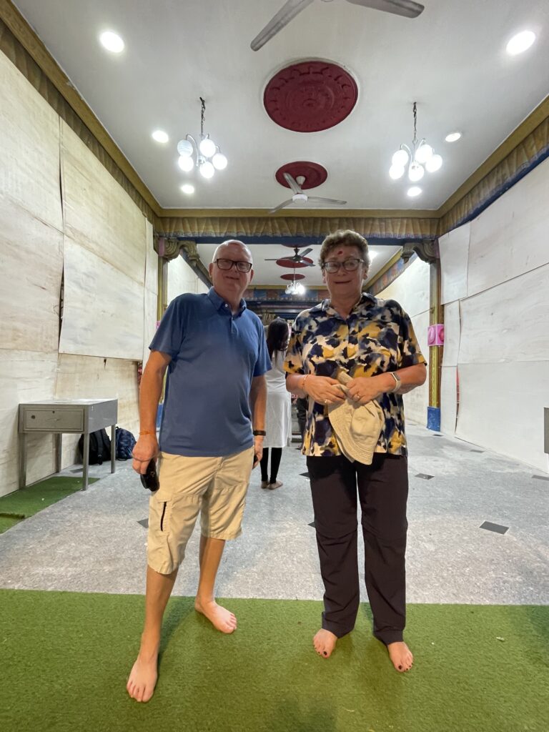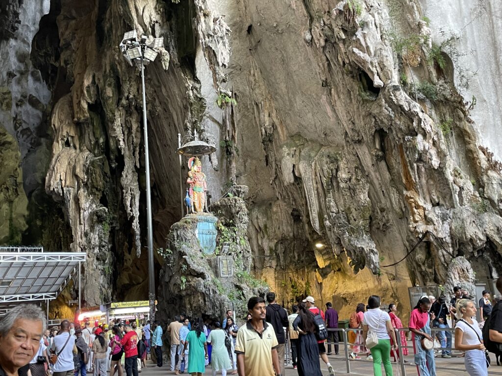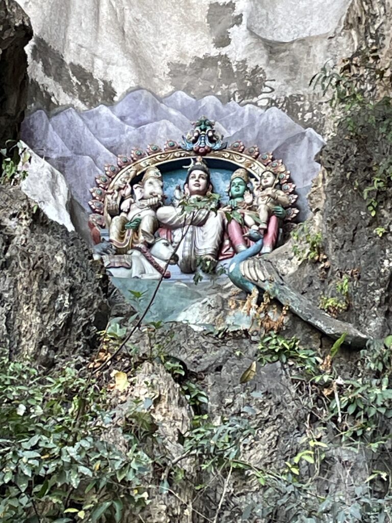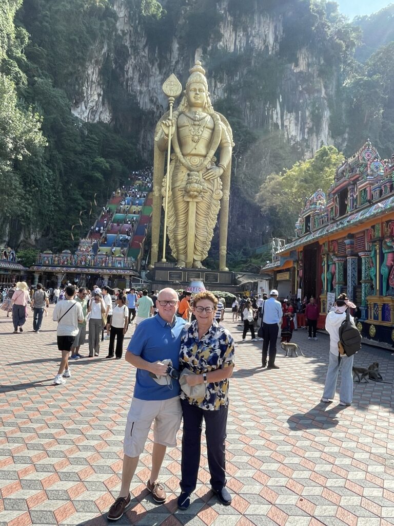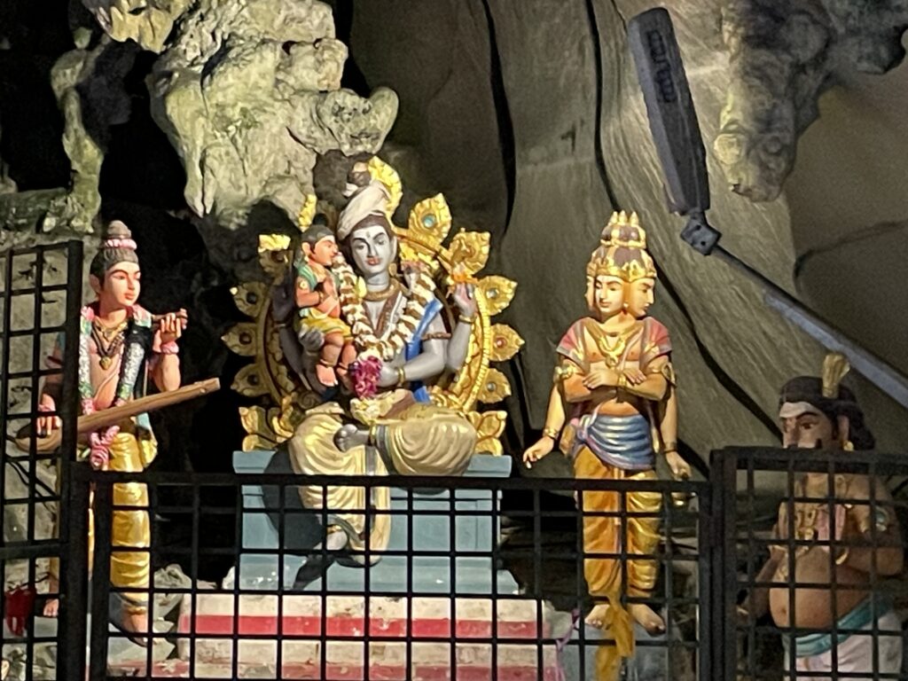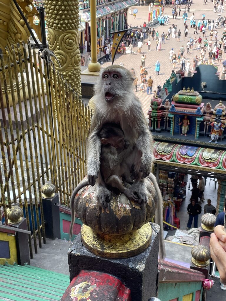 Then it was time to visit the Batu Caves – Hindu Temples carved into the rock at the top of a 272 step staircase which was tough. Then we went down 39 steps and up another 52 to the final temple where we had a blessing from the priest and got the marks on our foreheads which didn’t last long with all the significant sweating!! We enjoyed checking out the temples and watching one family carry a new born up the steps to be blessed – apparently this indicated that the couple had waited a long time before they were successful in their bid to have a family – so the precious cargo was very carefully carried up by the family swinging from a hammock until two large bamboo poles. Amazing!