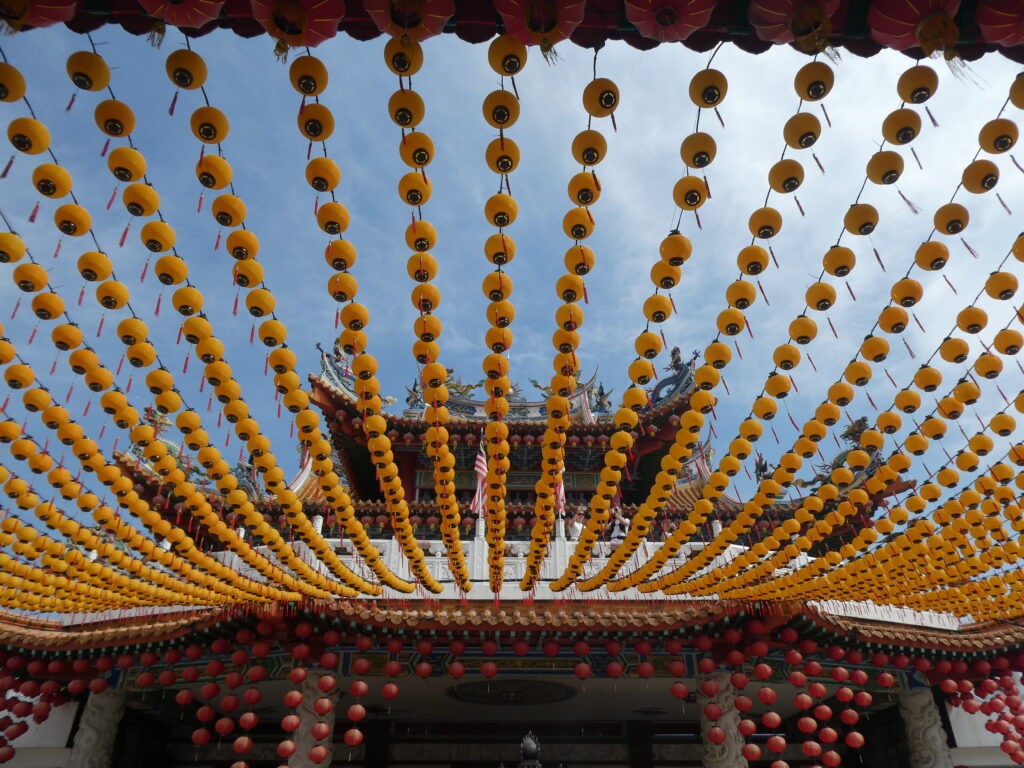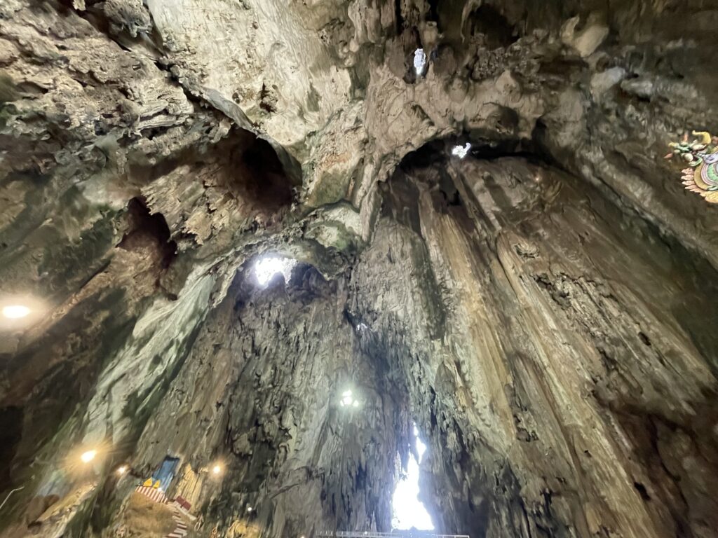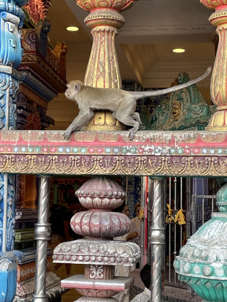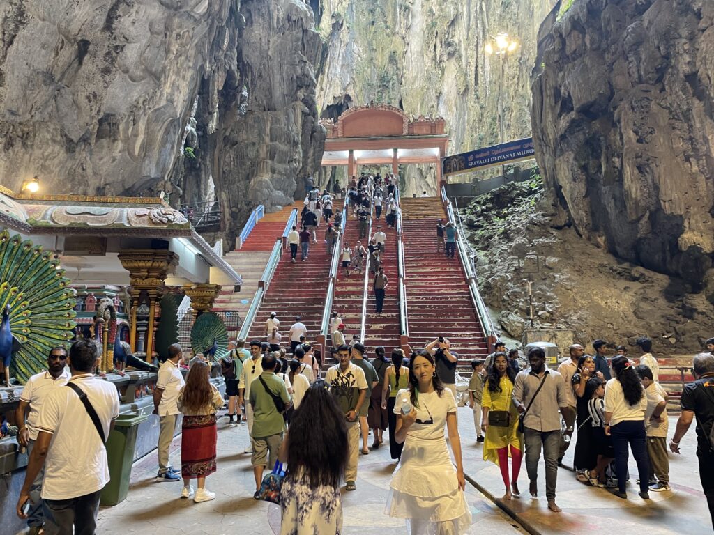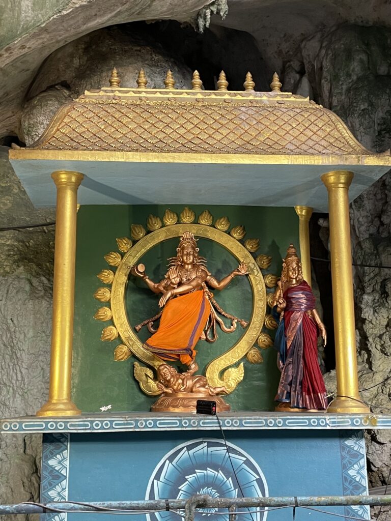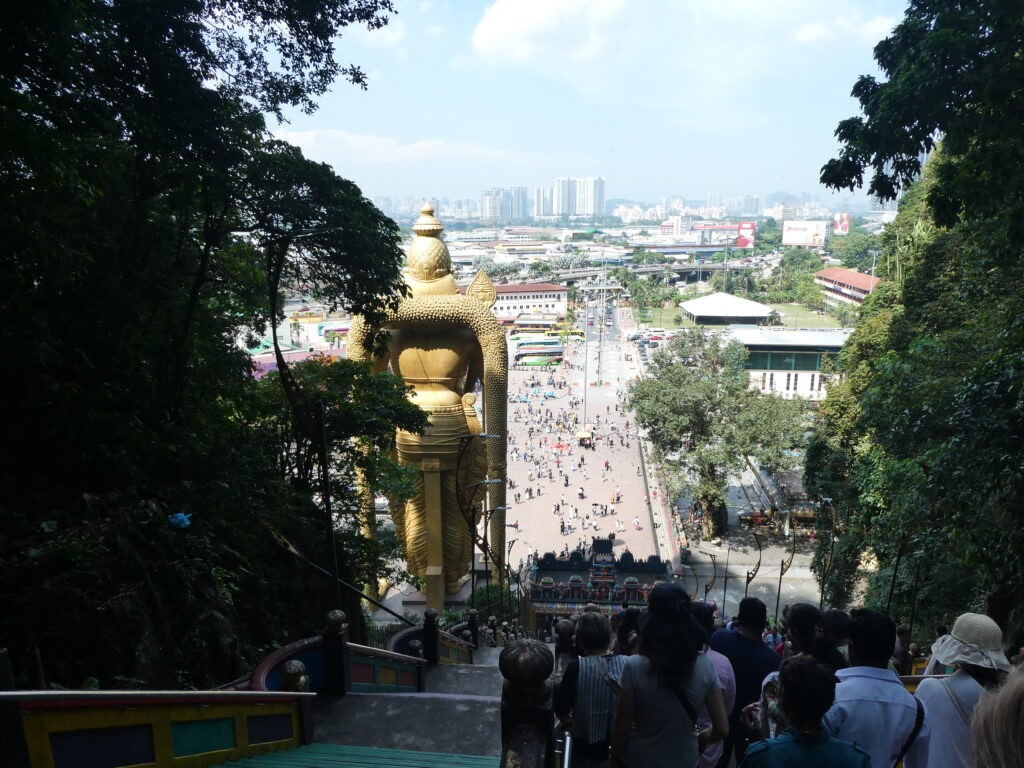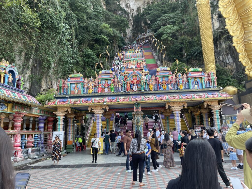 Then it was time to visit the Batu Caves – Hindu Temples carved into the rock at the top of a 272 step staircase which was tough. Then we went down 39 steps and up another 52 to the final temple where we had a blessing from the priest and got the marks on our foreheads which didn’t last long with all the significant sweating!! We enjoyed checking out the temples and watching one family carry a new born up the steps to be blessed – apparently this indicated that the couple had waited a long time before they were successful in their bid to have a family – so the precious cargo was very carefully carried up by the family swinging from a hammock until two large bamboo poles. Amazing!
