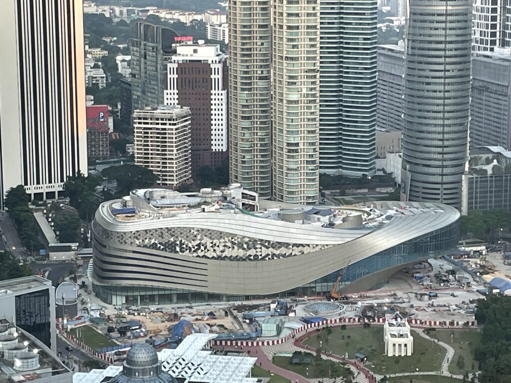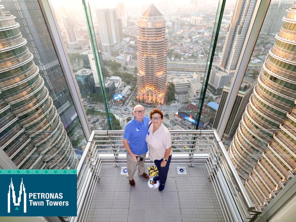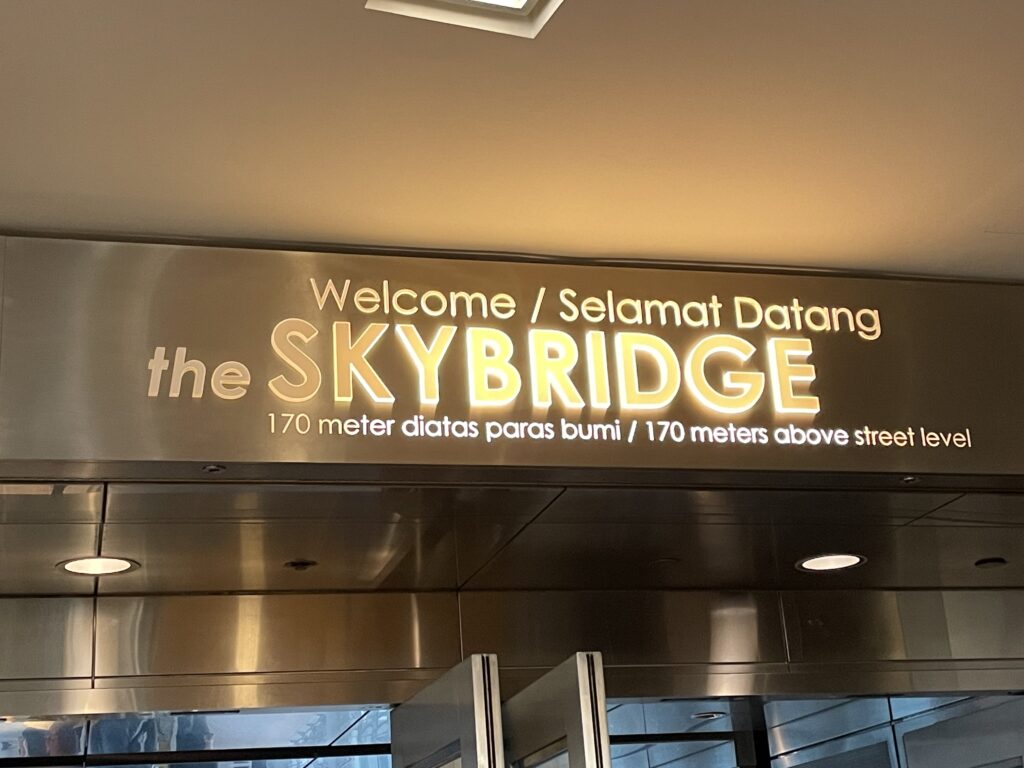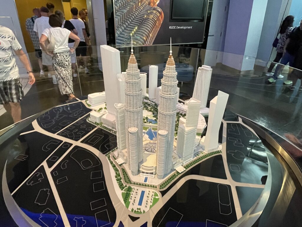 Having ticked all the boxes – jobs done – we headed back to our room and sorted out some clothes / had another shower. The temperature was 39 degrees centigrade but the humidity was 88% and I, personally, found it difficult to walk too far in these conditions… Never mind….anyway, all cleaned up and dressed suitably modestly we headed back down to reception and booked a Grab to take us to the Towers. On arrival we exchanged our tickets for blue stickers and headed to the connecting bridge. Sadly we missed the sunset (we should have made it but the queues to get into the Towers – even though we had pre-purchased tickets) made it just a little too late. We then went to the 83rd floor for stunning city views and the light show on the neighbouring City buildings. Then we moved back down to the 81st floor where there is a whole area dedicated to the construction of the buildings and the project – it is a fascinating bit of architecture. The marine grade stainless steel (our assumption) cladding didn’t have a bit of rust on it…would love to know how they achieved that LOL. We thought that there would be rust at least at the rivetted points but none to be found.