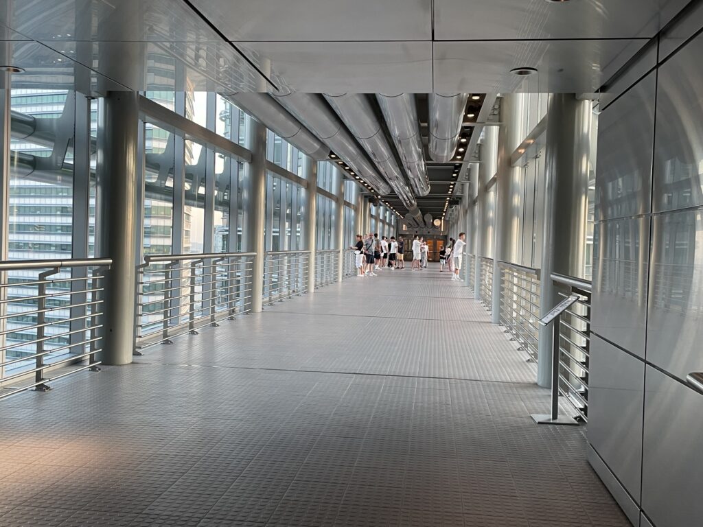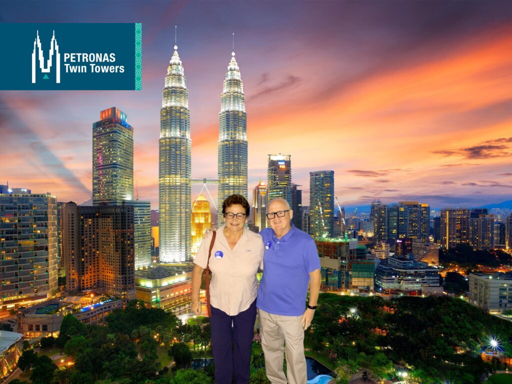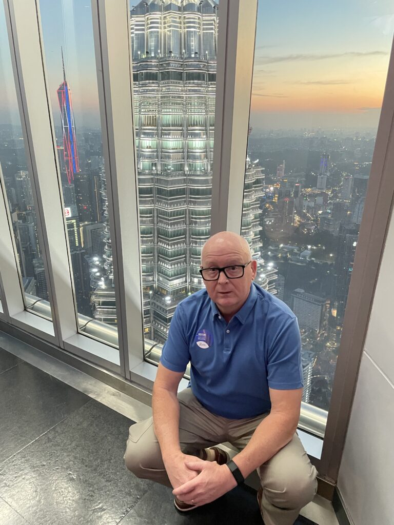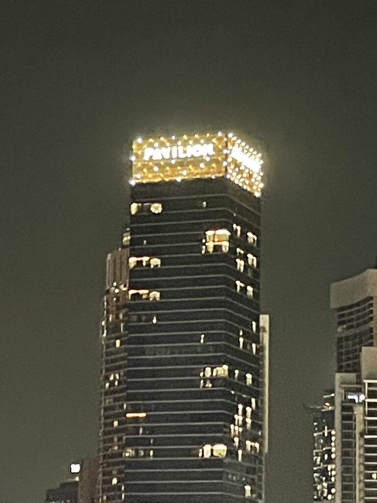 Having ticked all the boxes – jobs done – we headed back to our room and sorted out some clothes / had another shower. The temperature was 39 degrees centigrade but the humidity was 88% and I, personally, found it difficult to walk too far in these conditions… Never mind….anyway, all cleaned up and dressed suitably modestly we headed back down to reception and booked a Grab to take us to the Towers. On arrival we exchanged our tickets for blue stickers and headed to the connecting bridge. Sadly we missed the sunset (we should have made it but the queues to get into the Towers – even though we had pre-purchased tickets) made it just a little too late. We then went to the 83rd floor for stunning city views and the light show on the neighbouring City buildings. Then we moved back down to the 81st floor where there is a whole area dedicated to the construction of the buildings and the project – it is a fascinating bit of architecture. The marine grade stainless steel (our assumption) cladding didn’t have a bit of rust on it…would love to know how they achieved that LOL. We thought that there would be rust at least at the rivetted points but none to be found.