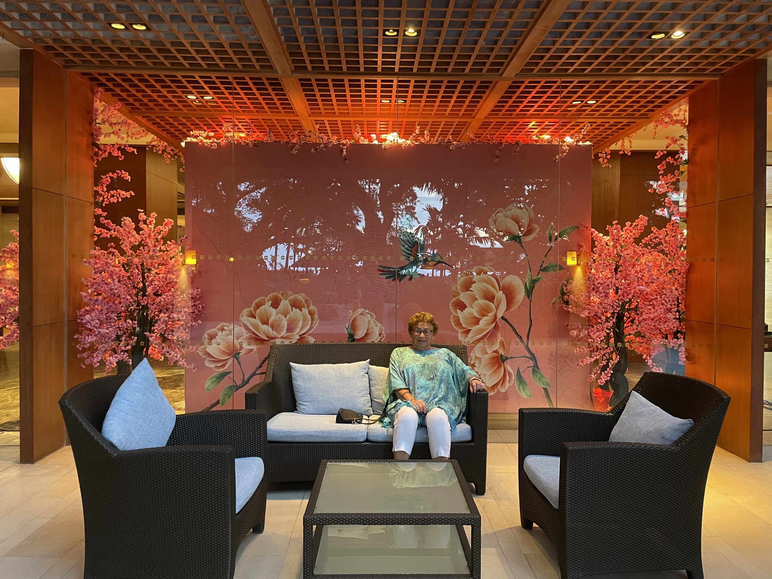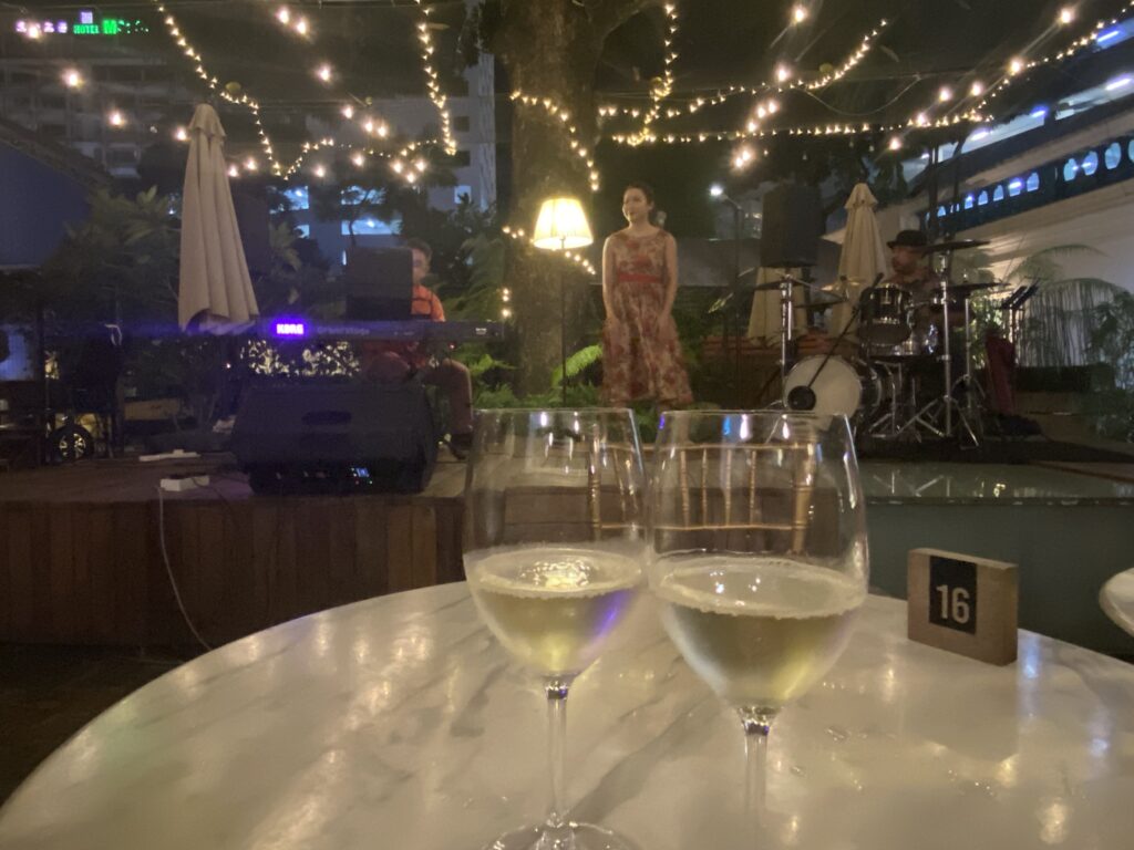 We headed to our very spacious room – unpacked – and then went to the small adult-only Rasa Wing pool and enjoyed resting up all afternoon under a cloudy sky. Later on we returned to our room, got cleaned up, and headed down to the Rasa Lounge which served complimentary drinks and canapes between 5 and 7 pm. Drinks were flowing freely including one of our favourite wines….so very happy!